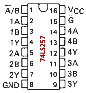 Dies ist ein elektronischer Umschalter, der insgesamt vier getrennte Schalter mit je zwei Eingängen (A & B) und einem Ausgang (Y) zur Verfügung stellt. Über Pin-1 (A/B) wird gesteuert, ob der Eingang A oder B zu Y durchgeschaltet wird.